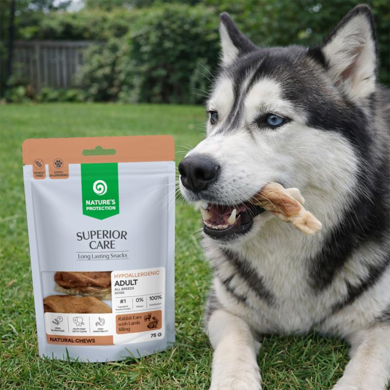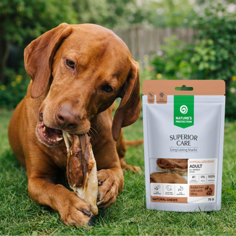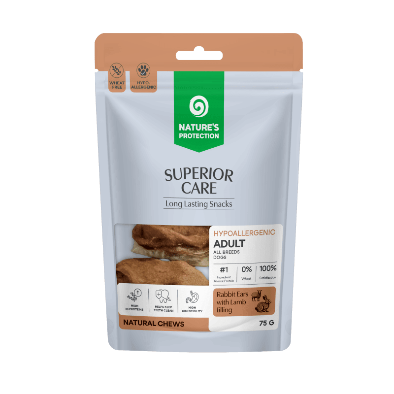 Nature’s Protection Superior Care godbidder til voksne hunde af alle racer, kaninører med lammefyld, er mere end bare en snack. Det er en naturlig tyggegodbid med et funktionelt fyld, designet til daglig forkælelse og ekstra fordele – fra tandhygiejne til opretholdelse af velvære.