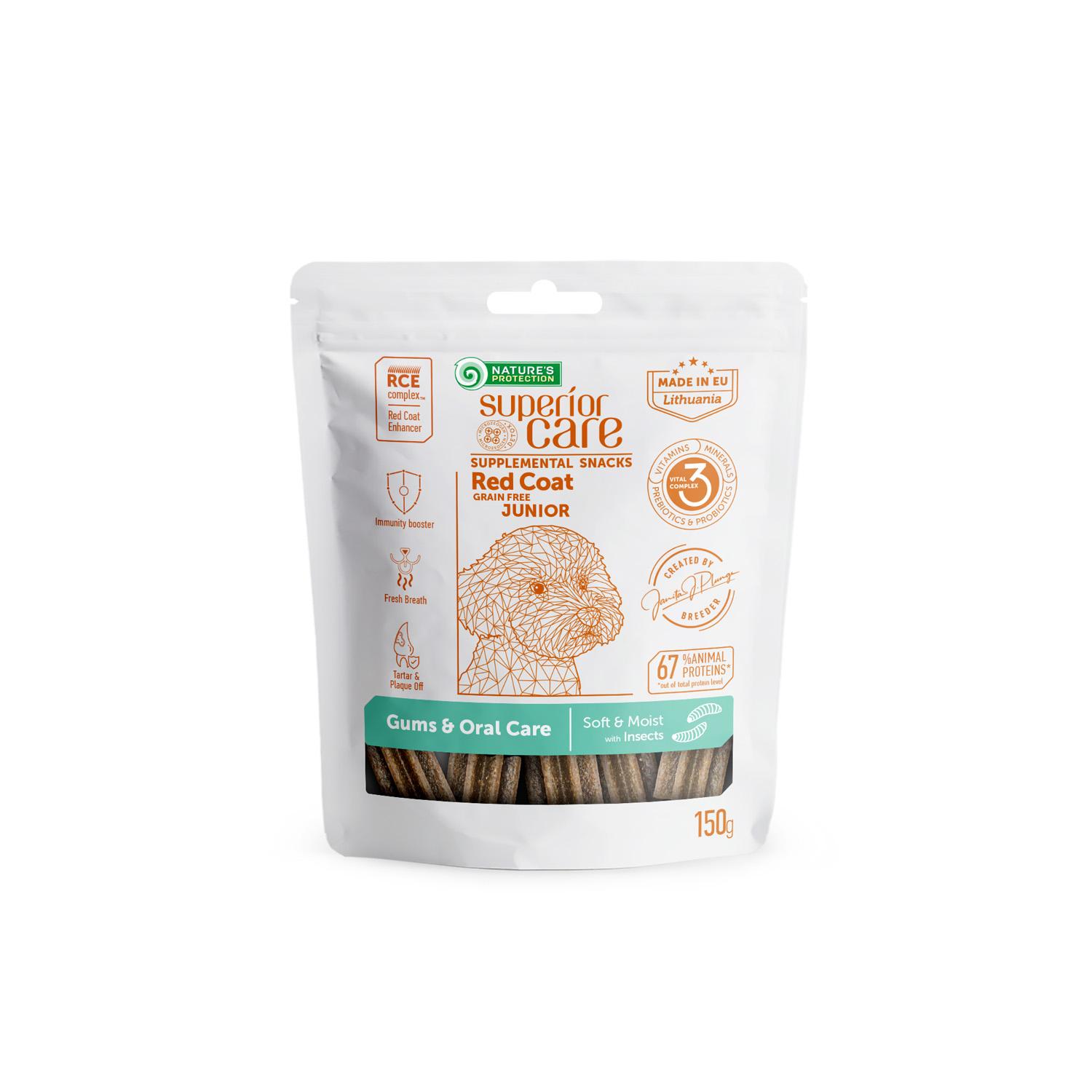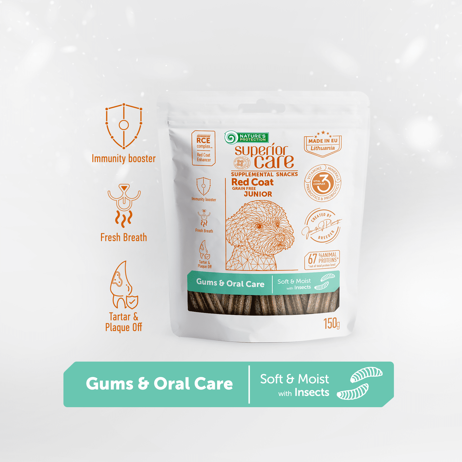 Nature’s Protection Superior Care Red Coat Grain Free Gums & Oral Care supplerende snacks perfekt til kæledyrs generelle velbefindende og mundhygiejne. Den vigtigste proteinkilde i disse supplerende snacks er insekter, et meget bæredygtigt protein, der kræver mindre jord, vand og foder end traditionelle husdyr. Insektprotein er rigt på protein af høj kvalitet, essentielle aminosyrer, vitaminer og mineraler og er også hypoallergen, hvilket gør det til et fremragende valg for hunde med fødevareoverfølsomhed eller allergi. Disse funktionelle snacks og kosttilskud har en vådere og blødere tekstur end de sædvanlige godbidder. Våde produkter har en mere naturlig aroma, hvilket gør dem til en favorit for selv de mest kræsne kæledyr. De supplerende snacks er beriget med clinoptilolit af vulkansk oprindelse fra naturen – MicroZeoGen, som hjælper med at fjerne giftstoffer og forbedre næringsoptagelsen. Den unikke produktionsteknologi og mineral-natriumpolyfosfat i godbidderne har antibakterielle egenskaber, der kan hjælpe med at reducere antallet af bakterier og dermed reducere den ubehagelige lugt i hundens mund. De supplerende snacks indeholder ikke ingredienser af korn, majs eller sojaprodukter, der kan forårsage allergiske reaktioner.