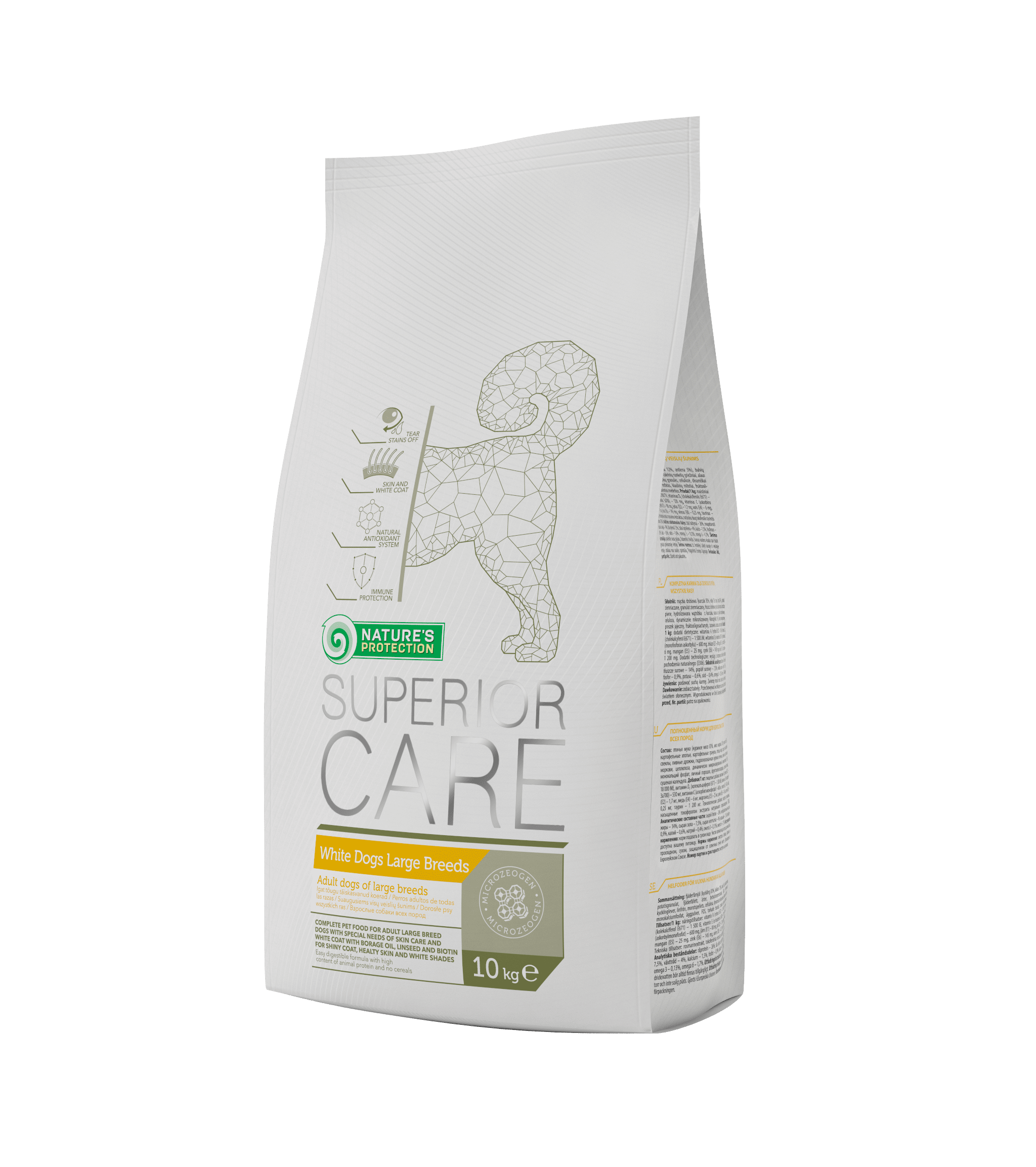 Nature’s Protection Superior Care White Dogs Large Breeds – et tørfoder til store racer af hvidcellede hunde, baseret på en unik formel, kan ikke kun hjælpe med at bekæmpe problemet med udseendet af tårepletter, men giver også kæledyrets krop den nødvendige mængde nyttige næringsstoffer.