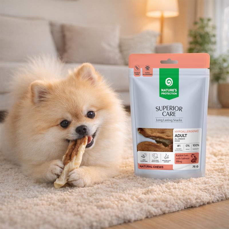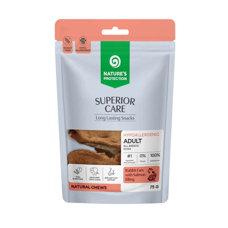 Las golosinas Nature’s Protection Superior Care para perros adultos de todas las razas, orejas de conejo con relleno de salmón, son más que un simple tentempié. Se trata de una golosina natural para masticar con un relleno funcional, diseñada para mimar a diario y aportar beneficios adicionales, desde la higiene dental hasta el mantenimiento del bienestar.