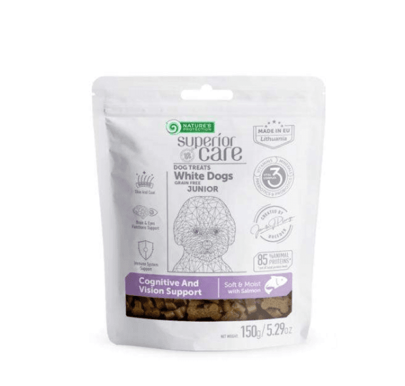 Gli snack integrativi Superior Care White Grain Free Sensitive Care di Nature’s Protection per cani bianchi sono perfetti per il benessere generale e la cura sensibile degli animali domestici. La principale fonte proteica di questi snack integrativi è il salmone, una proteina altamente digeribile e ipoallergenica, ricca di acidi grassi omega-3, vitamine e minerali. Inoltre, il salmone è noto come una fonte proteica altamente appetibile. Questi snack funzionali – integratori hanno una consistenza più umida e morbida rispetto ai soliti bocconcini. I prodotti più umidi rivelano un aroma più naturale, rendendoli i preferiti anche dagli animali domestici più esigenti. Gli snack integrativi sono arricchiti con clinoptilolite di origine vulcanica di origine naturale – MicroZeoGen, che aiuta a rimuovere le tossine e a migliorare l’assorbimento dei nutrienti. La composizione contiene microalghe Schizochytrium sp. che sono una fonte di vitamine come A, C, E e K, oltre a minerali come ferro, zinco e selenio. Questi nutrienti aiutano a sostenere una visione sana. Mentre gli acidi grassi Omega-3 supportano le funzioni cerebrali. Gli snack integrativi non contengono ingredienti di origine cerealicola, mais o prodotti di soia che possono causare reazioni allergiche.