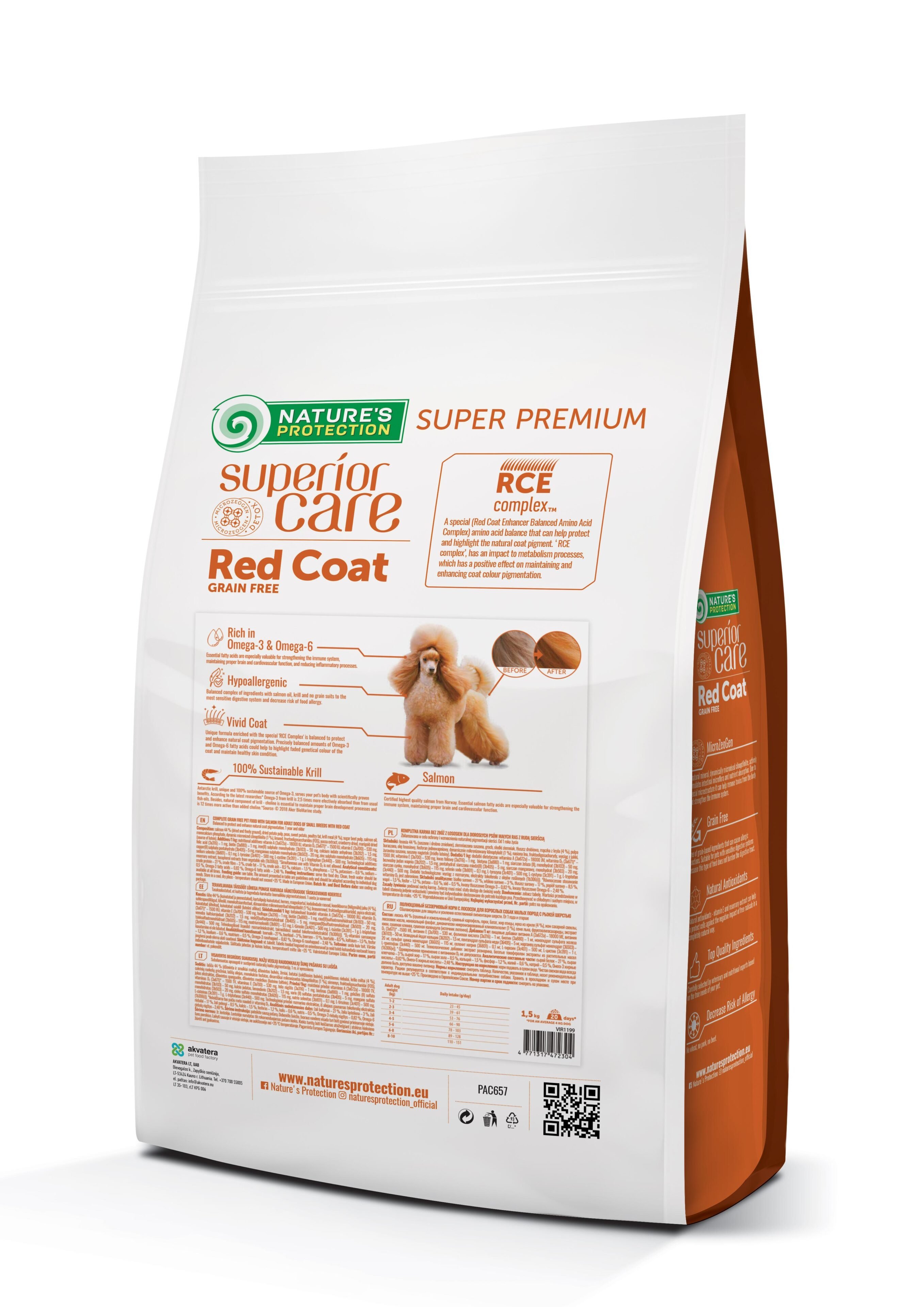 Nature’s Protection Red Coat Grain Free with Salmon for Adult Small Breed dogs is well known for its RCE Complex (Red Coat Enhancer Balanced Amino Acid Complex), a balanced composition that helps protect and enhance the natural pigmentation of the brown and red coats and maintain the clear tiers and saliva composition. The main source of protein in this dry dog food is Salmon. It is a high quality protein that is an excellent source of nutrition for dogs, as it is packed with essential nutrients that can help promote good health. It also contains an Antarctic krill, a unique and 100% sustainable source of Omega-3 and choline, which improves skin and coat condition, supports brain activity. The complete and balanced composition of this dry dog food is enriched with clinoptilolite of volcanic origin from nature – MicroZeoGen. It helps to remove toxins from the pet’s body and when it is detoxified the efficient nutrients, vitamins, and minerals easily absorb into the body. The composition is enriched with Omega-3 and Omega-6 fatty acids essential for healthy skin and coat conditions. As well as mono- and polyunsaturated fatty acids support the immune system, while saturated fatty acids provide energy to a dog.
